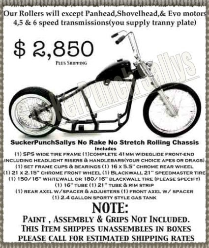 | I decided to go with the SPS No Rake, No Stretch rolling chassis, with the apes, and the 150/16" whitewall rear tire. How can you go wrong with a shop like this... | ||||||||||||||||||||||||||||||